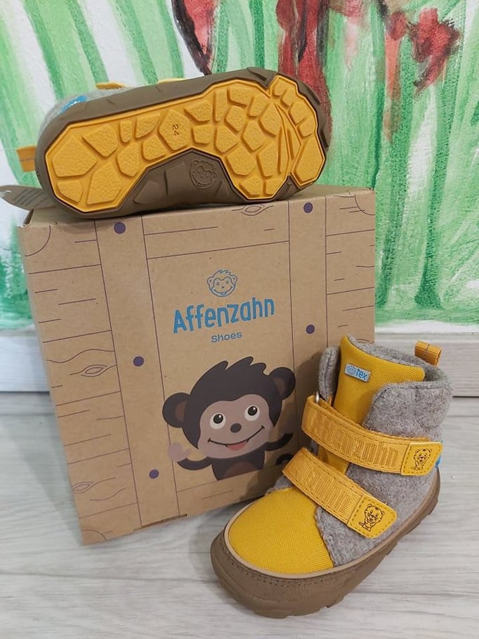 -Das Bild links ist die Marke "Affenzahn". Die Schuhe sehen nicht nur super aus, sondern haben eine super flexible Sohle und einen klasse Fersenhalt. Das Profil der Sohle sorgt für einen rutschfesten Auftritt, auch bei glatten Untergründen.